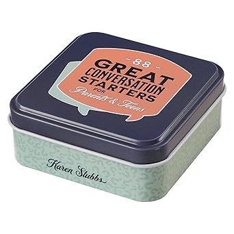 Break through the meh's and uh's and connect with your teen through words when you use the 88 Great Conversation Starters for Parents and Teens Cards in a Tin as a fun dinner time game.